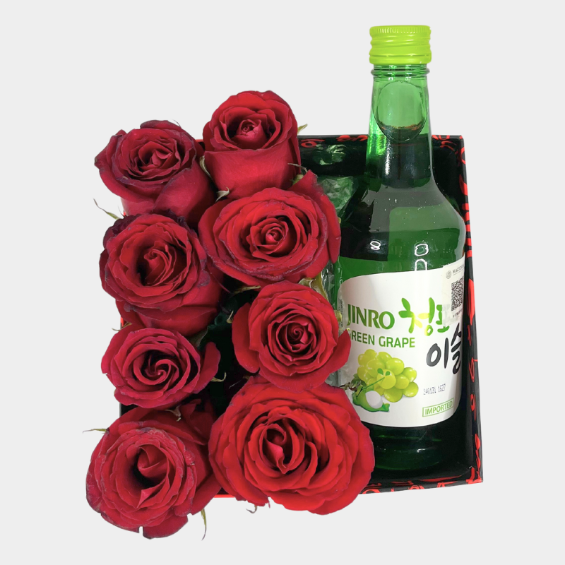 Jinro Green Grape Soju con Rosas Rojas, una combinación sublime de frescura y romance que hará de cada brindis un momento inolvidable. ¡Haz que tu celebración sea única y memorable con este regalo especial!